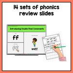 • 14 sets of phonics review slides (alphabet, CVC words, digraphs, blends)