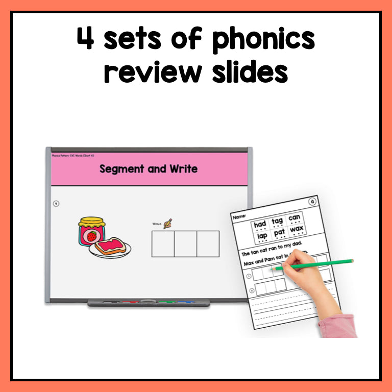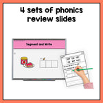 • 4 sets of phonics review slides (alphabet, CVC words, digraphs, blends)